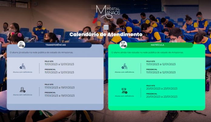 Conforme o calendário de matrículas para acesso às redes públicas de ensino em 2023, divulgado pelo Governo do Amazonas e a Prefeitura de Manaus, as rematrículas dos alunos iniciaram nessa quinta-feira, 15/12, e vão até 5 de janeiro de 2023. Além da rematrícula o calendário mostra as datas relacionadas a períodos de transferência, matrícula para novos alunos tanto no ensino fundamental e médio, como creches.